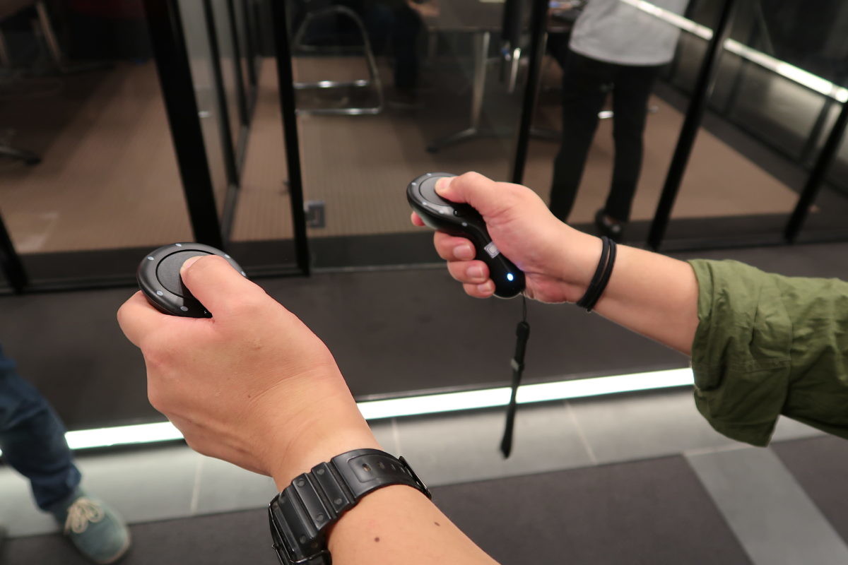 また、専用のVRコントローラーを腕に装着、手に持って体験。端から見ていると、何を一人でやっているんだコイツは!?感は否めないですが、それだけ没入感が半端ないということです。同行した編集部員玉造もトライ!