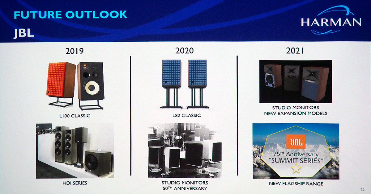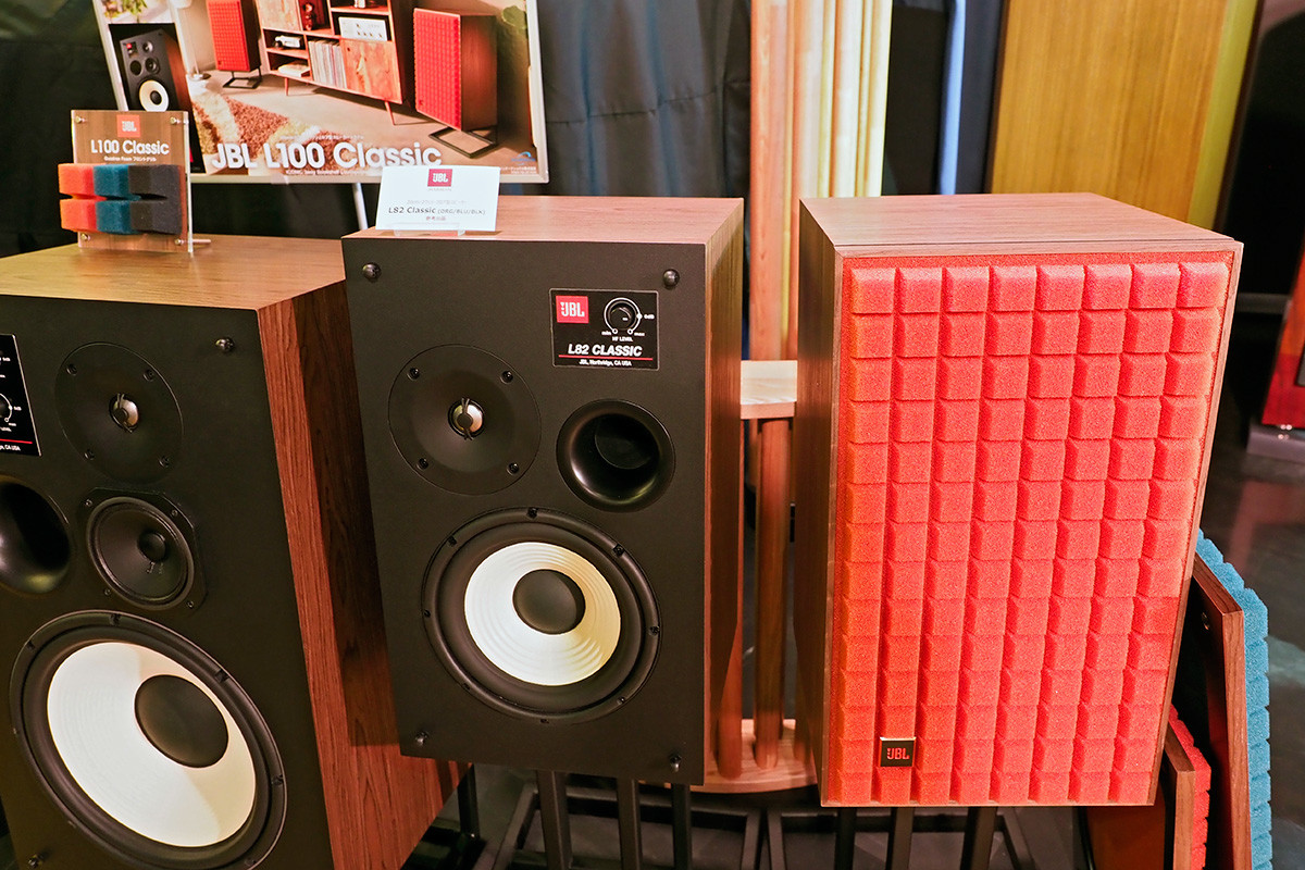 今回、世界初公開されたJBLのスピーカーが「L82 Classic」です。200mmウーハーを採用した2Wayバスレフ型で、ツイーターは上級モデルと同じチタン製の25mmドーム型を採用。名前にClassicが付いていますが、クラシック音楽向けという意味ではなく、往年の名機「L100 Century」を現代の技術で復刻させたモデルが「L100 Classic」だったのです。その弟分なのでClassicの名前を引き継いでいるというわけ。価格はペア25万円前後で、L100で評判の良かった専用スタンドもペア3万円で、どちらも2020年には発売されそうです。