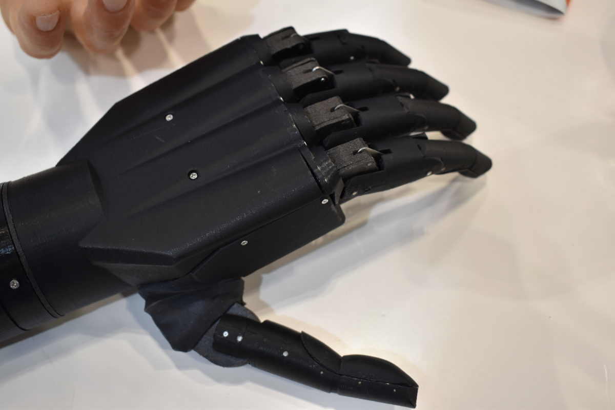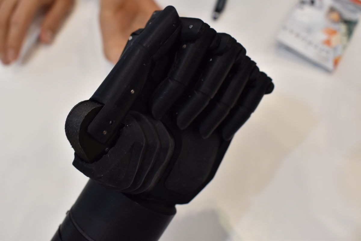 スタートアップ企業が並ぶブースで目を引いたのは、コロンビアのProtesis Avanzadas SASが展示していた、3Dプリンターで制作した義手。人間の手と同じ関節を持ち、マグカップを持ち上げたり、ペンを握って字を書いたりできます。