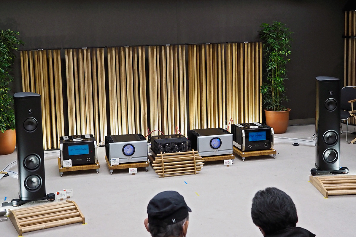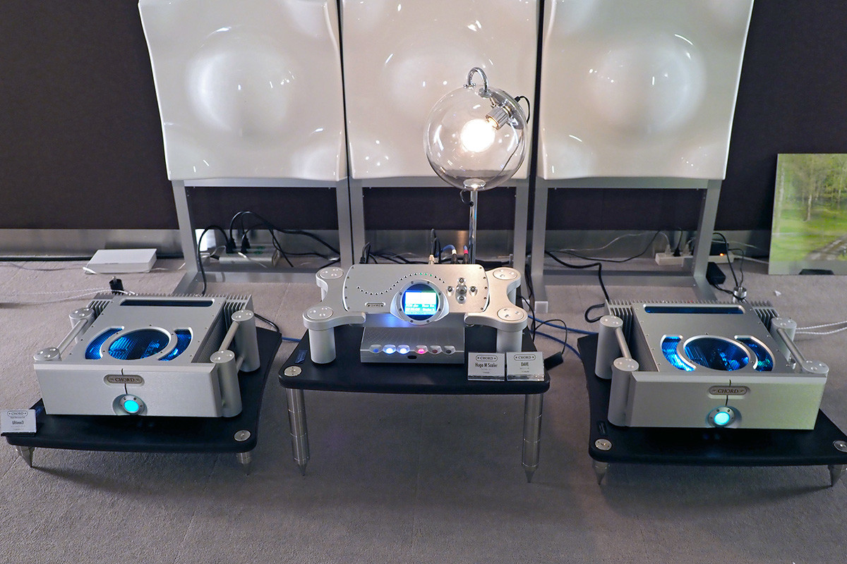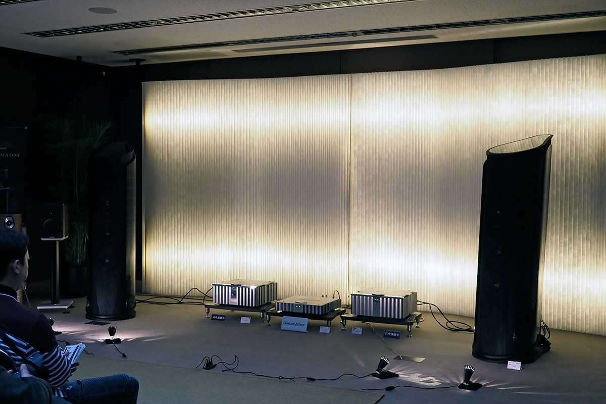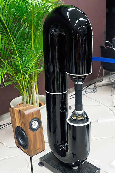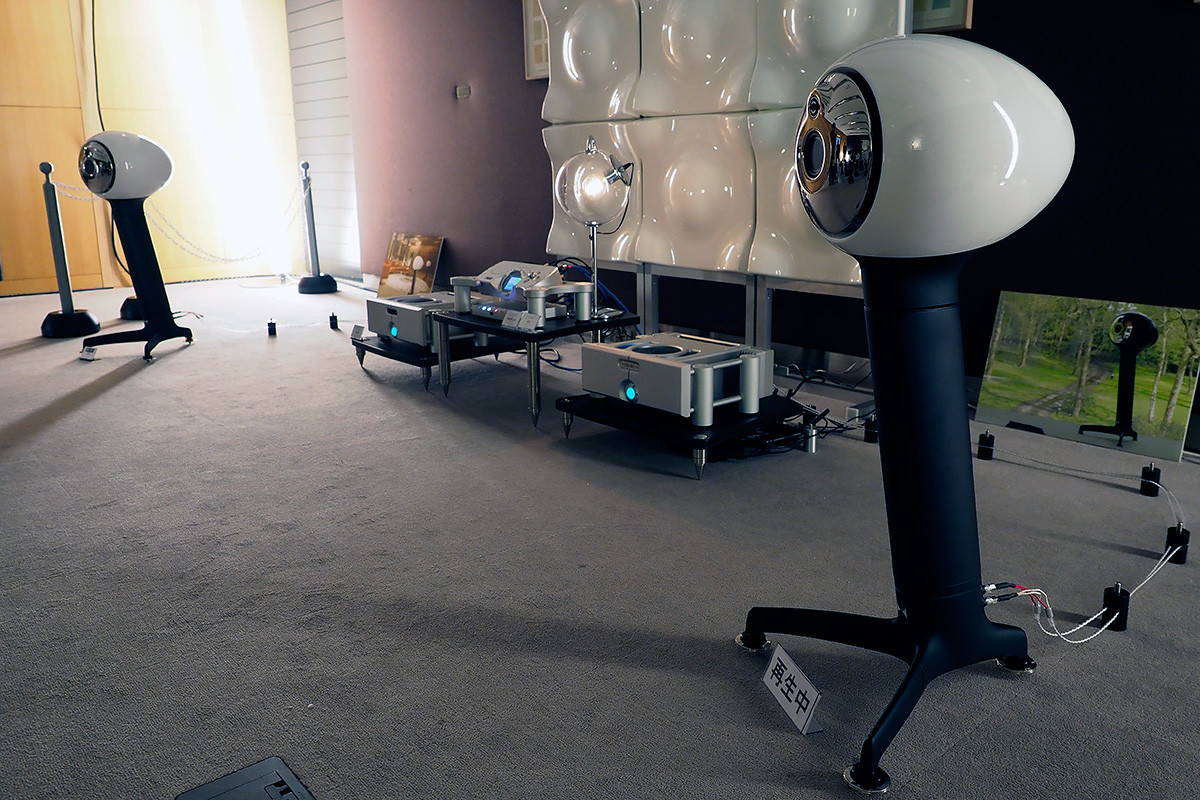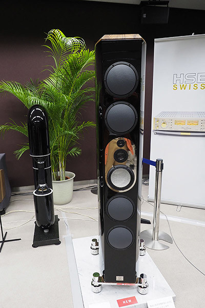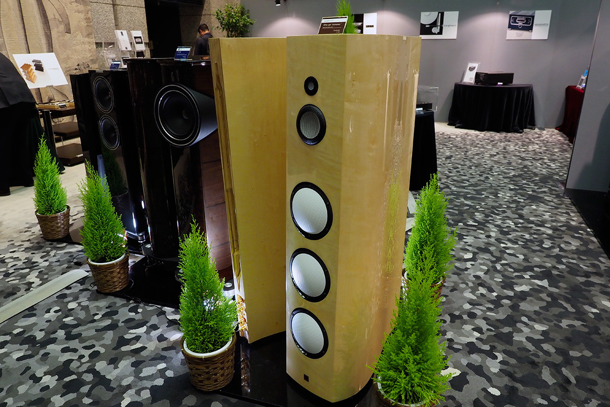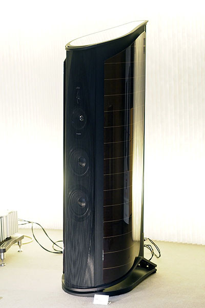 エステロンとは耳慣れないブランドですが、エストニア共和国の首都、タリンに2010年にアルフレッド・ワシリコフ氏が創設。究極のスピーカー製作を追求して、エンクロージャーを鳴らさないために、大理石をパウダー状にして、樹脂などと混ぜた複合素材を使って鋳造成型しています。これにより継ぎ目がなく複雑な構造を実現。F1のボディを作っている工場で製作しているそうです。その仕上がりは美しく近未来を感じました。4Way5スピーカーの密閉型でツイーターはダイヤモンド、ミッドレンジはセラミック、ウーハーはアルミハニカムサンドイッチ構造を採用しています。高さ167.5cm、重さ150kgで1380万円です。
