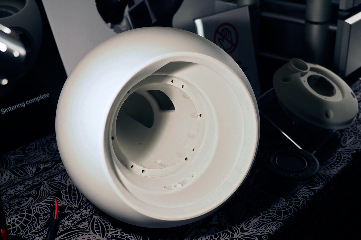 ツイーターはリングラジエーターで、ミッドレンジは平面振動板を採用。180度の指向性を持ちます。ウーハーは後ろ向きに取り付けられ14cmのコーン型です。エンクロージャーはガラス配合のナイロン材でレーザー焼結法の3Dプリンタにより作られています。受注生産で完成には2ヵ月かかりますが、製作過程を撮影してPDFファイルでオーナーに定期的にメールしてくれるサービスが実施されるそうです。カラーは色見本帳やYMCKの指定で自由に決められるそうです。「HYLIXA」は高さ43.3cm、重さ15kgで520万円です。
