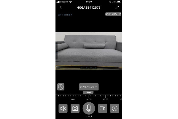 さっそく使ってみたところ、スマホ画面に鮮明な映像が映し出されました。画面をスワイプさせるとスワイプ方向と逆向きにカメラが稼働。画面の上で2本の指を広げれば、映像をアップで見られます。画面下の“カメラアイコン”“マイクアイコン”をタップすると、それぞれ“撮影”と“トーク”が可能。またアプリ内で警報などの設定もできるため、しっかりと防犯カメラとして活用できますね。