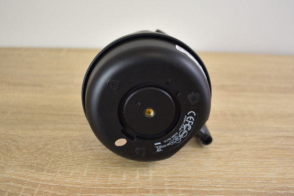 雪だるまのような見た目をした同商品は、黒色で統一されたシックなデザイン。サイズは約93(直径)×114.5mm(高さ)、重さは0.46kgほどです。本体の後ろにはアンテナが立っており、しっかり電波を受信できるようになっていました。