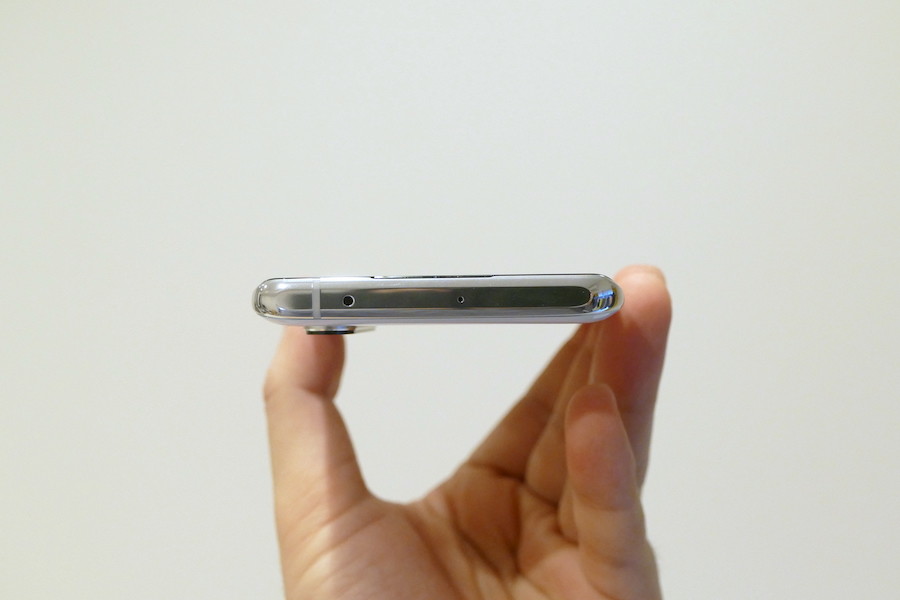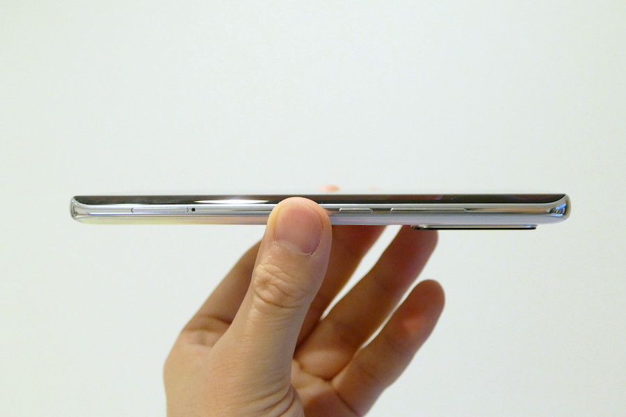 画面サイズは6.47型。筐体サイズはW74.2 × H157.8 × D9.67mmで、重さは208gあります。「iPhone 11 Pro Max」の幅がちょっとスリムになったくらいのサイズ感で、筆者の手では親指が画面の反対側までギリギリ届きます。