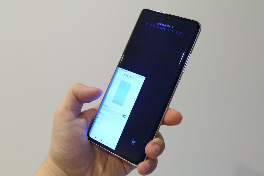 「片手操作モード」も用意されており、画面上端や反対側面に指が届かない時に活用できます。設定から片手操作モードをオンにしておけば、ナビゲーションバーを左右にスワイプすることで、切り替え可能。