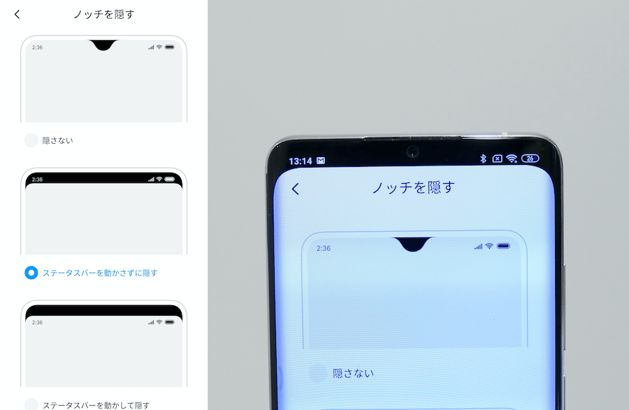 ディスプレイ上部には、水滴型のノッチがあります。なお、設定からノッチを隠すモードを2種類選択でき、好みに応じてカスタイマイズ可能。