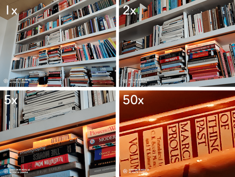 望遠に関しては、カメラアプリのUI上では2xと5xがあります。5倍を選択しても、ノイズがない状態で撮影できる機種はまだまだ限られているので、貴重な存在です。一応、MAXで50倍まで撮影できますが、倍率を上げるとノイズが目立ちます。ノイズの少ない実用的な写真が撮影できるのは5〜10xが限度と覚えておきましょう。