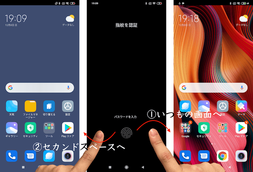 1つ目は、「セカンド・スペース」機能です。PCで言うところユーザーを切り替えるようなもので、セカンド・スペースとして登録したパスコードや指紋によって、通常のスペースとは切り離された2つ目のホーム画面へとログインできます。例えば、セカンド・スペースに入って撮影した写真や、インストールしたアプリなどは、通常時には表示されません。筆者は仕事で資料用の写真やスクリーンショットを大量に撮影するので、ビジネスとプライベートシーンで分けて使えたら便利だな、と感じました。