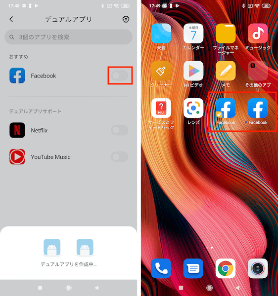 2つ目は「デュアルアプリ」機能。一部の海外メーカー製のスマホではもはやお馴染みの機能(ツインアプリと呼ばれることも)なので、ご存知の方も多いとは思いますが、FacebookやLINEなどのアプリアイコンを2つ用意でき、それぞれ異なるアカウントでログインしておけるというものです。ちなみに、先ほどのセカンドスペースを活用すれば、4つのアイコンを用意できることに。