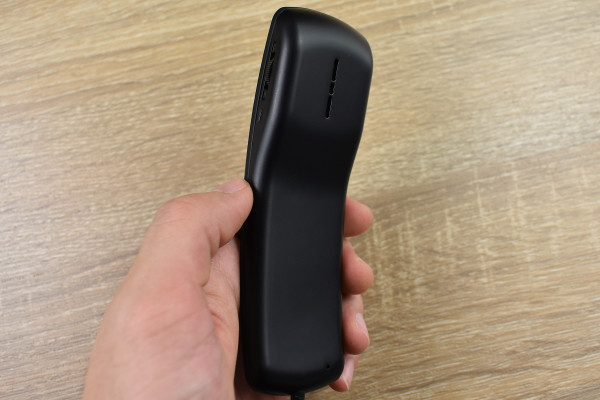 同商品のサイズは約40(幅)×22(奥行)×130mm(高さ)、重さは80gほど。コンパクトな受話器から1.2mほどのケーブルがのびており、先端には4極ミニプラグがついています。かなりコンパクトなデザインなので、カバンなどに入れてもかさばらないはず。