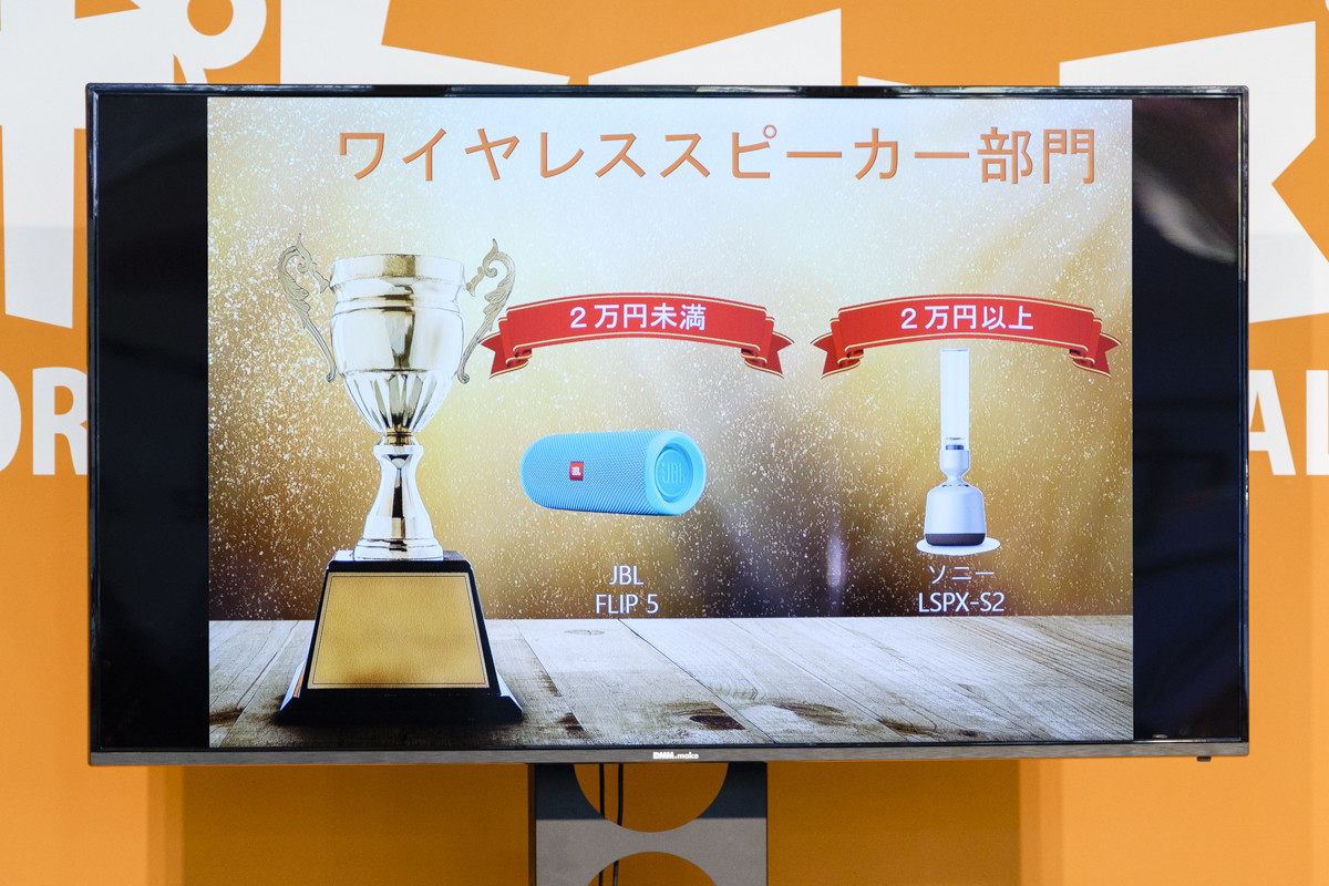 ワイヤレススピーカー部門には、鉄板中の鉄板と野村さんが太鼓判を押す、JBLのFLAPシリーズの進化を続けた最新版のバージョン5が受賞しました。ソニーLPX-S2に関しては「これは、お洒落な照明器具にスピーカーが付いているというモデルです。音を聞かれたことのある人は分かると思いますが、実は本格的な音が出ます。侮れません」とコメントしていました。