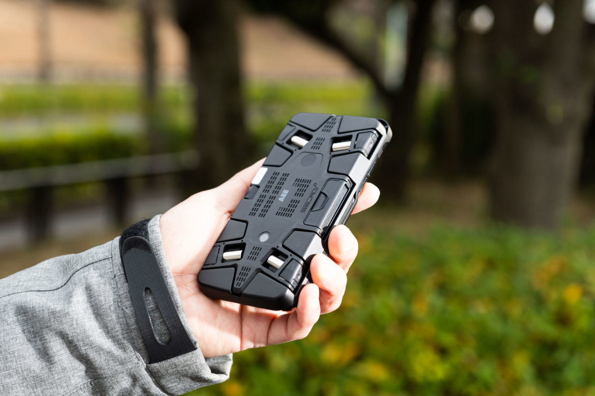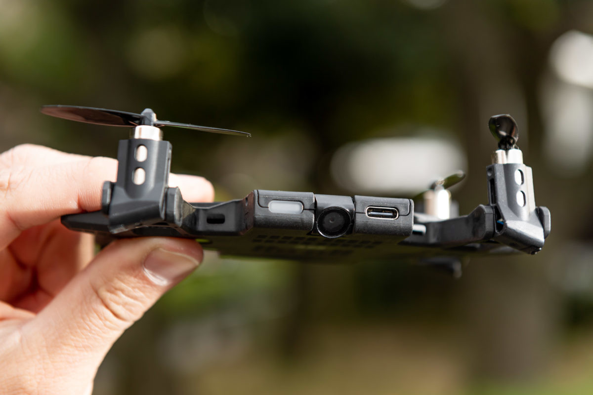 この機体のいいところは、なんといってもケースを活用した持ち運びやすさ。別売りのiPhoneケース(iPhone X/XS用もしくはiPhone X Max用)に収めれば、文字通りスマホケースとして持ち歩くことができます。重量は約68g(ケースは別)と超軽量。飛ばしたい場所まで持って行ったら、素早く取り外してスマートに飛ばすことができます。