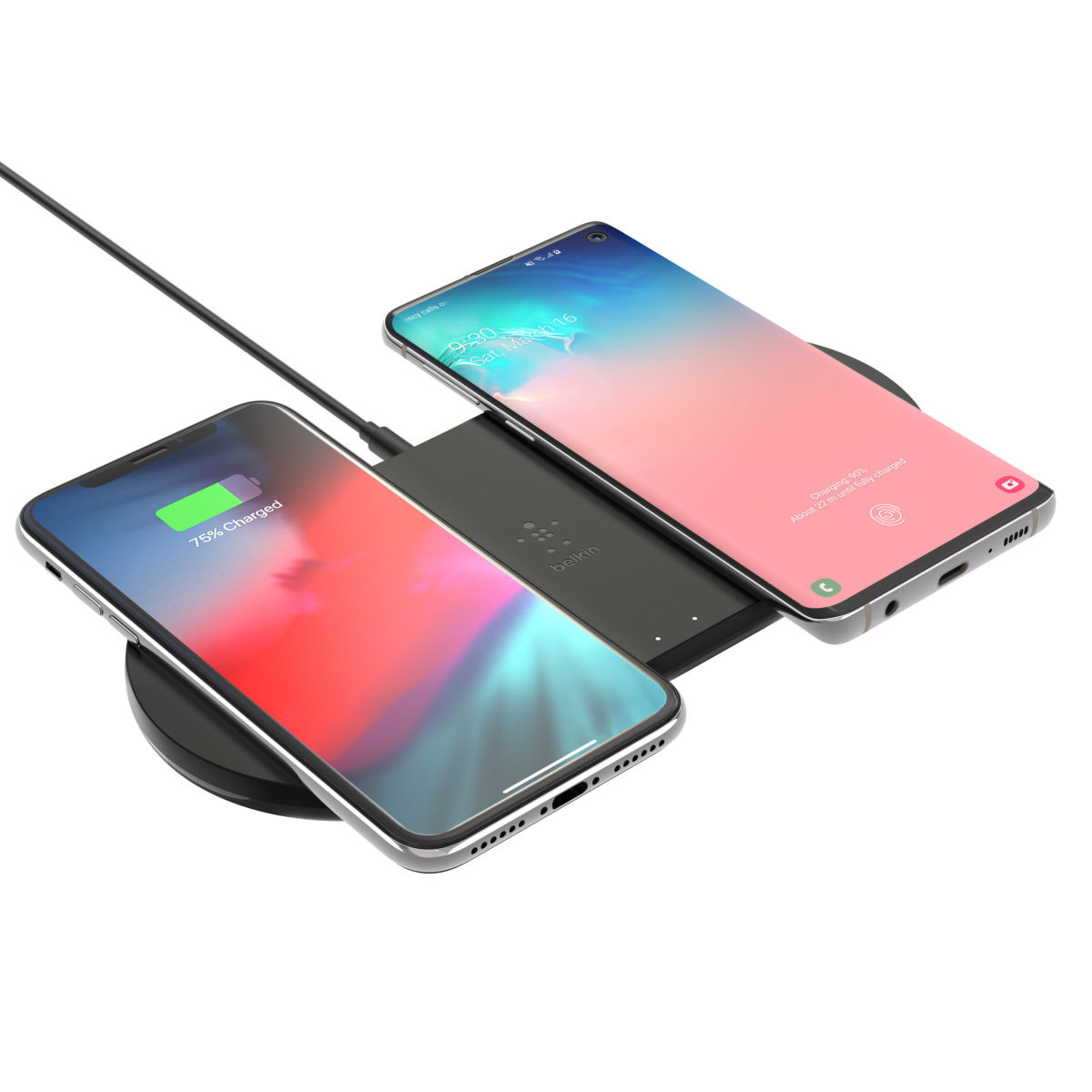 「BOOST↑CHARGE Dual Wireless Charging Pads 10W」は、スマートフォンをパッドに固定するのに役立つ滑り止めグリップ付きで、2台のスマートフォンに最大10Wの安全で便利な高速ワイヤレス充電を提供。4ft(約120㎝)のケーブルも付属します。