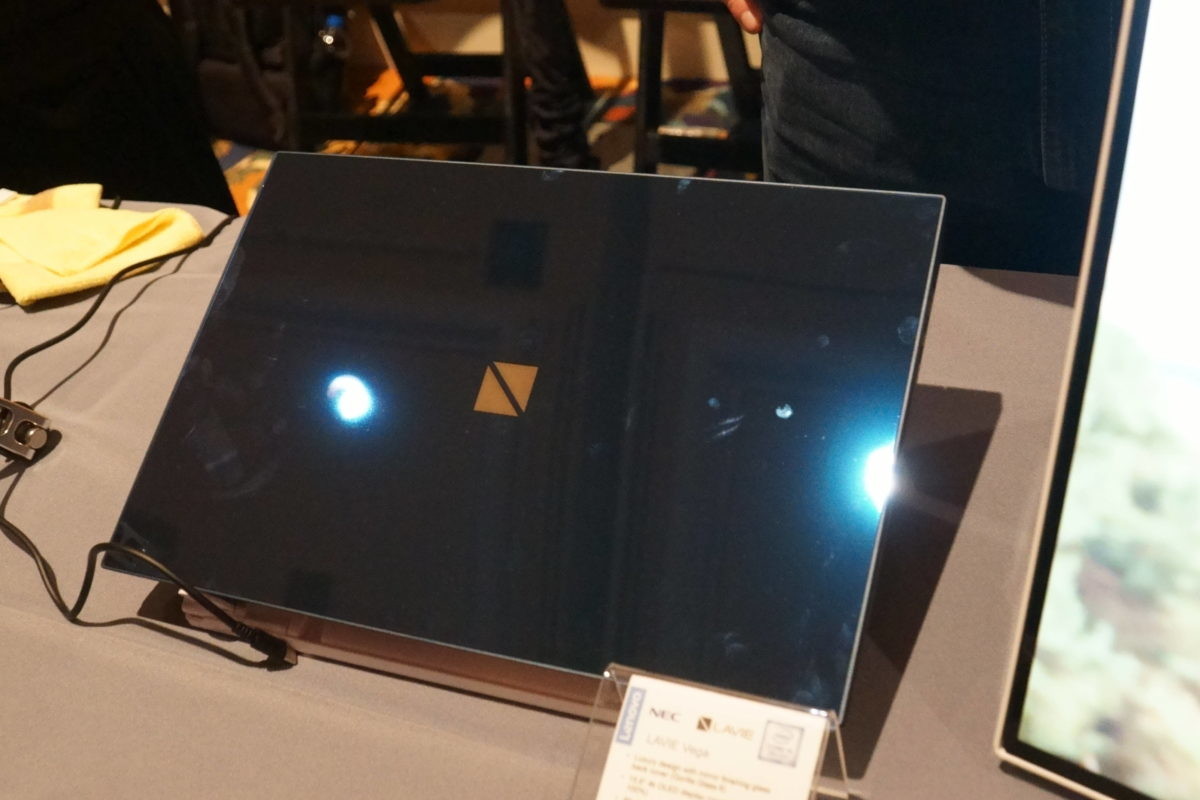 LAVIE VEGAは、天面のガラスだけでなく、輝度400nitの有機ELディスプレイが特徴の15.6インチノートPCです。Lenovoブースの一角に設けられたNECのコーナーでは、ガラスの天面に鉄球を落とすデモを行っていましたが、キズひとつ付いていませんでした。