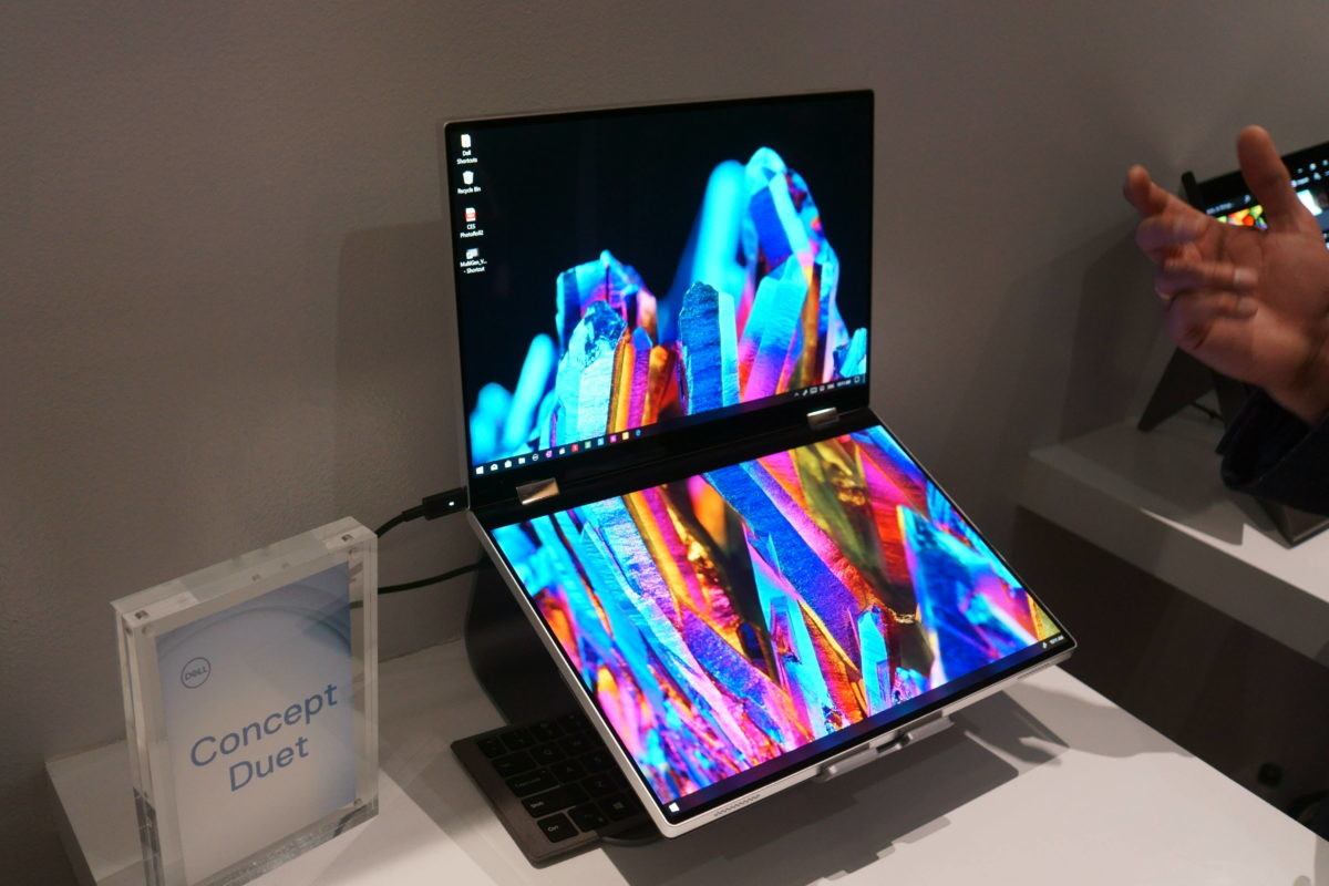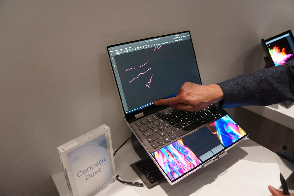 DELLは2つの画面を搭載したコンセプトモデル「Concept Duet」を展示していました。13.4型の2つの画面では、それぞれ別の作業をすることができます。また、大きな1画面として利用したり、片方で表示していたウィンドウをもうひとつのウィンドウにスワイプして移動することもできました。また、ディスプレイには手書き入力が可能、キーボードを置いてタッチパネルを画面表示して利用することもできるなど、表示スタイルだけではなく入力方式にも配慮した設計となっていました。デモでは非常にスムーズな動きを見せていましたが、スペックなどは不明です。