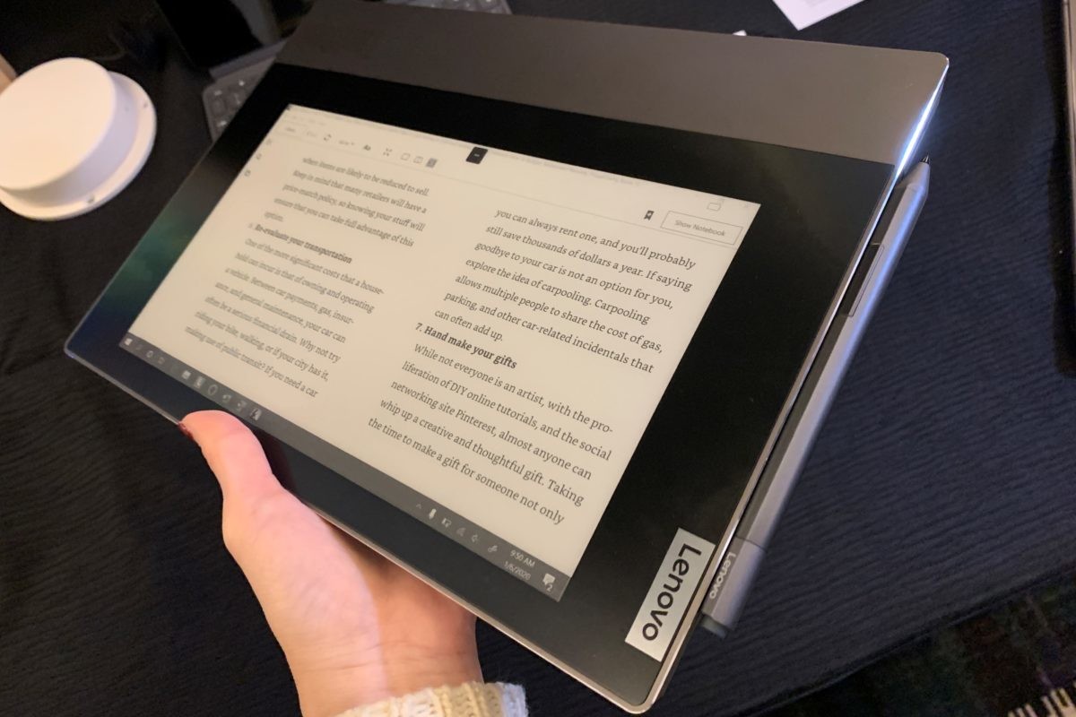 Lenovoは、PCの背面にもディスプレイを設置する機種も発表しました。それは13.3型ノートPC「ThinkBook Plus」。背面には10.8型E Inkディスプレイが搭載されています。E Inkディスプレイには、通知やカレンダー、メールなどを表示することができ、背面ディスプレイで確認した内容をPCを開いてメインディスプレイで読むことができます。イメージとしては、ガラケーにあった小さな背面ディスプレイに近いかも知れません。