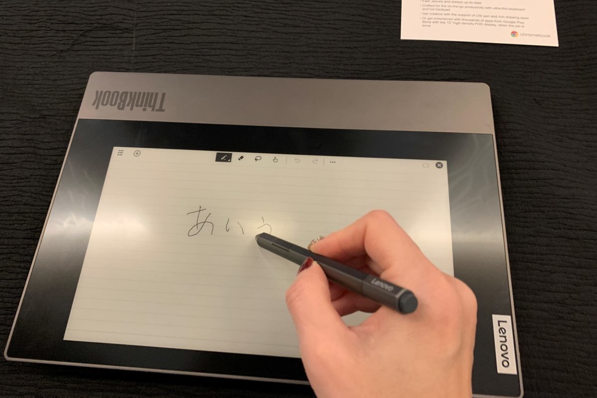 背面ディスプレイにはペンによる手書き入力も可能です。PCを開かなくても、メモ書きやスケジュール確認ができるようになっているんですね。ただし、2枚のディスプレイが搭載されているだけあって、正確な数値はわかりませんがかなりの重量でした。