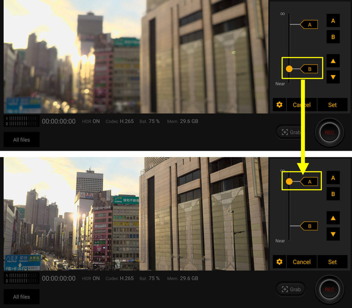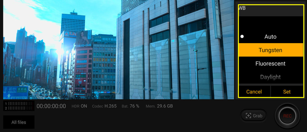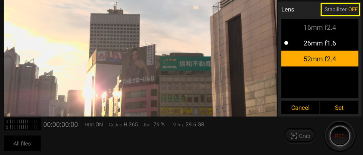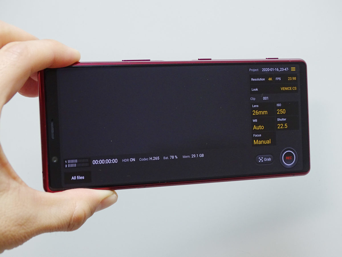 映画館のワイドスクリーンと同じ、画角比率21対9の動画記録にも対応。同時に「Grab」をタップすると、現在フレームに表示されている画像を21対9の比率で静止画としてキャプチャもできます。