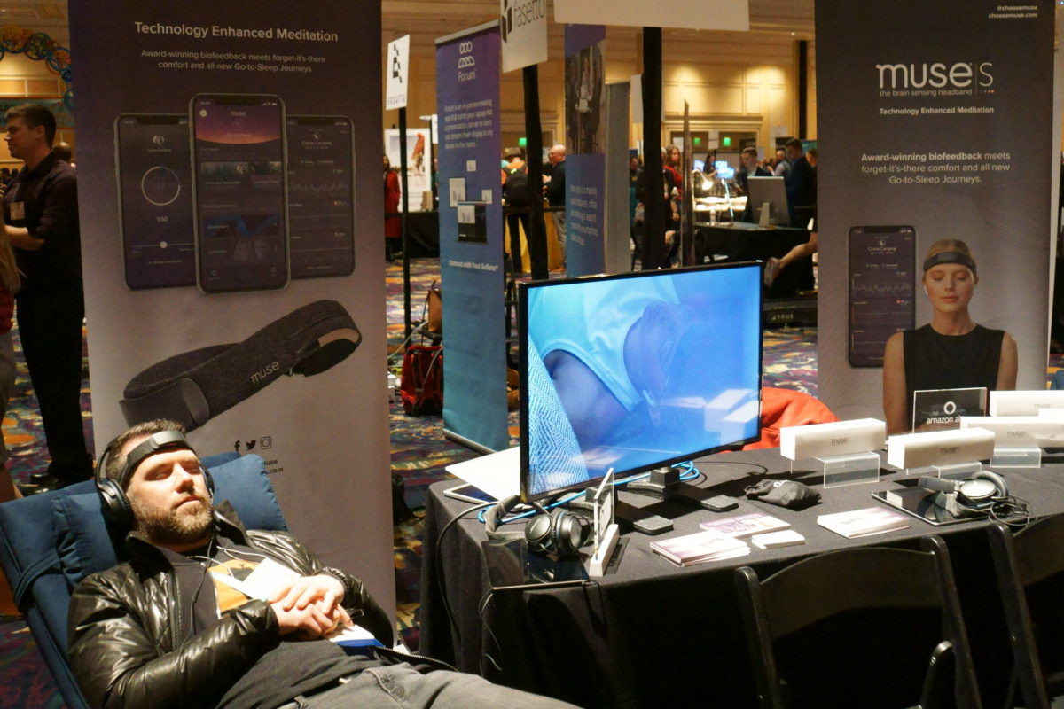 この「Muse S」(InteraXon)は、2019年のCESにも出展された製品を改良した、眠りを促すヘッドバンドです。脳波、心拍数、呼吸、体の動きをセンサーによって検知し、リアルタイムで電気信号を返すことにより、リラックスした瞑想状態に導きます。イヤホンを装着し、波の音などを聞きながら音声ガイダンスを聞くことで、「睡眠への旅」に出られるのです。
