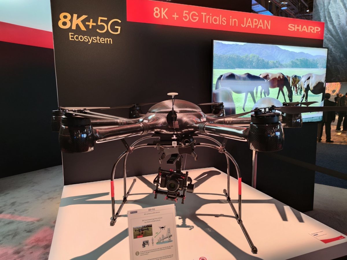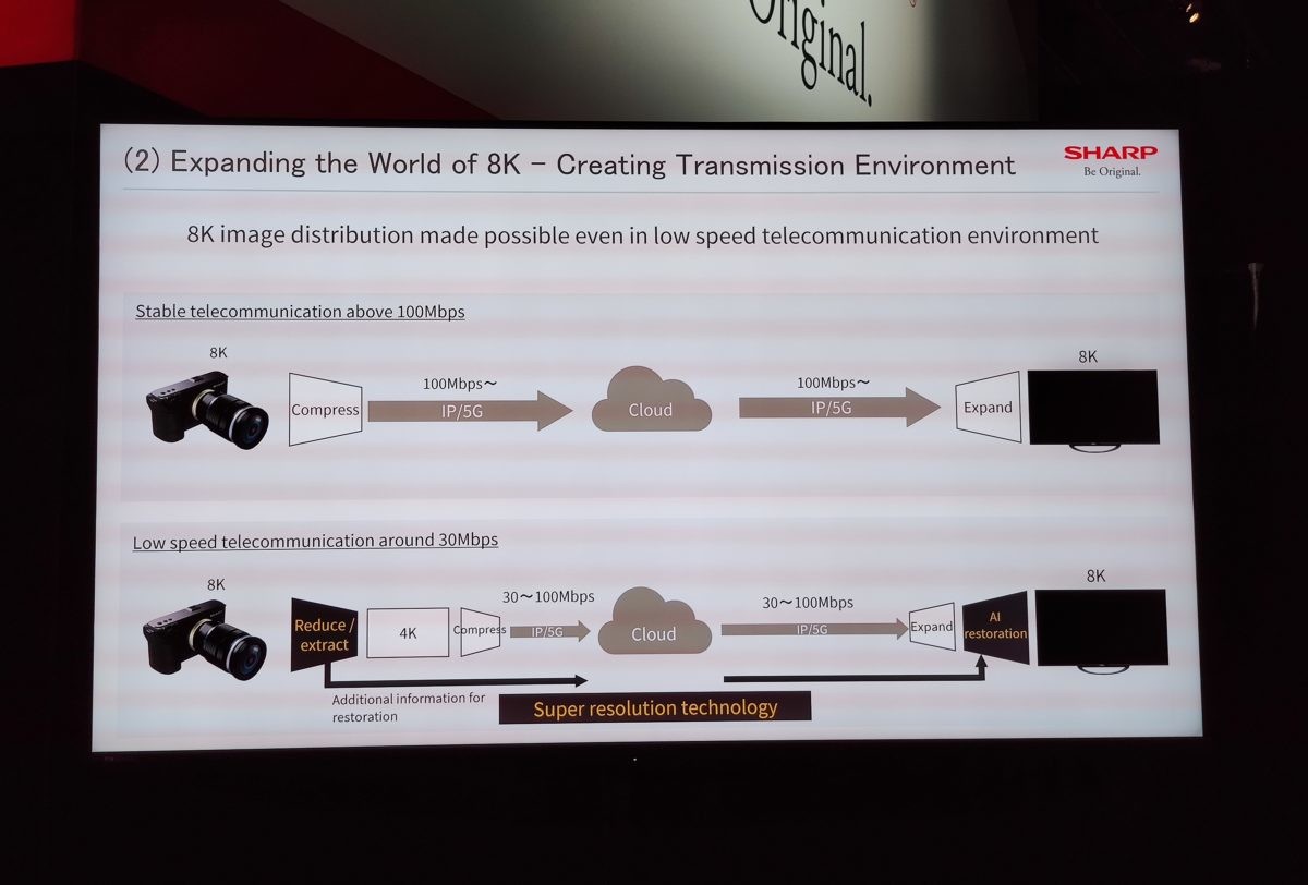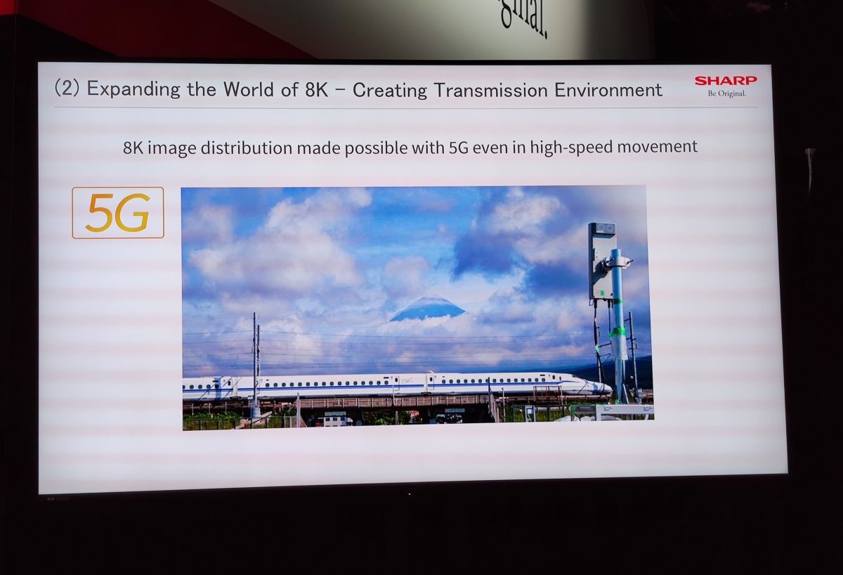 シャープはすでに日本でキャリアと一緒に行う5Gの実証実験に参加しています。昨年9月には、8Kコンテンツを時速284kmで走行する新幹線の車両に送信する実験の成功も。なお、5Gサービスが始まったとしても、常に100Mbpsを超える高速通信が実現することは難しいと考えているとのこと。そこで、8Kの映像を圧縮して4Kサイズにして伝送し、8Kに復元して再生する超解像技術を導入。これにより、30Mbps程度の通信速度でも、8K映像の伝送が実現するそうです。