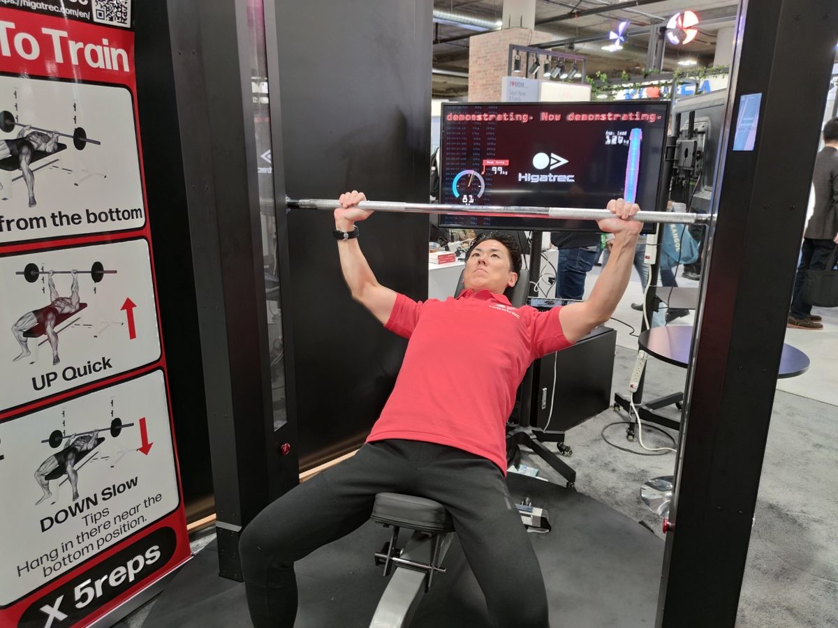 「ヒガトレック」はウエイトのプレートを取り付けることなく、電子制御によって負荷を調整し、その人の目的に合ったトレーニングを行えるマシンです。ちなみに「ヒガトレック」の名称は、同社のCEOで、パーソナルトレーナーでもある比嘉一雄氏の名前に因んだもの。比嘉氏によると、ウエイトトレーニングを行う際、バーベルを持ち上げる時の重さと、下げる時の重さは変えるのが効率的なのだそう。「ヒガトレック」では、それを実現し、最も効率のよい方法でトレーニングが行えるそうです。