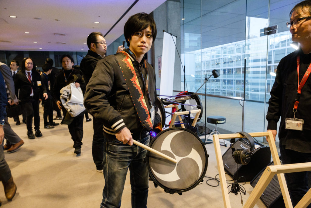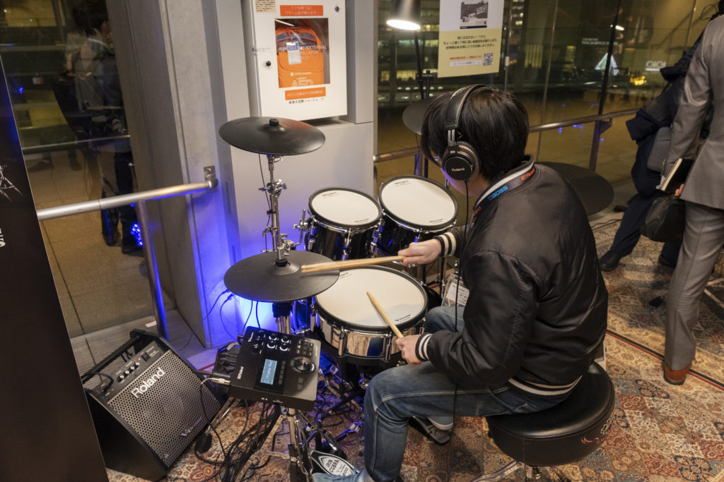 機材のハイクオリティ化が見えたアイテムは、ギター関連以外にもあります。写真は、パッと見た感じでは、普通のドラムを叩いているように見えますが、それがまさに「凄い」ところ。叩き心地もバスドラを踏んだ感じも、アコースティックドラムそのままなのですが、これ実は「VAD」シリーズという電子ドラムなのです。ローランドの電子ドラムと言えば「V-Drums」が有名です。VADシリーズの正式名称も「V-Drums Acoustic Design」と、V-Drumsの系譜にあるのですが、見た目の通りアコースティックドラムさながらの存在感を持ち、本格的な演奏感を得られる設計になっています。