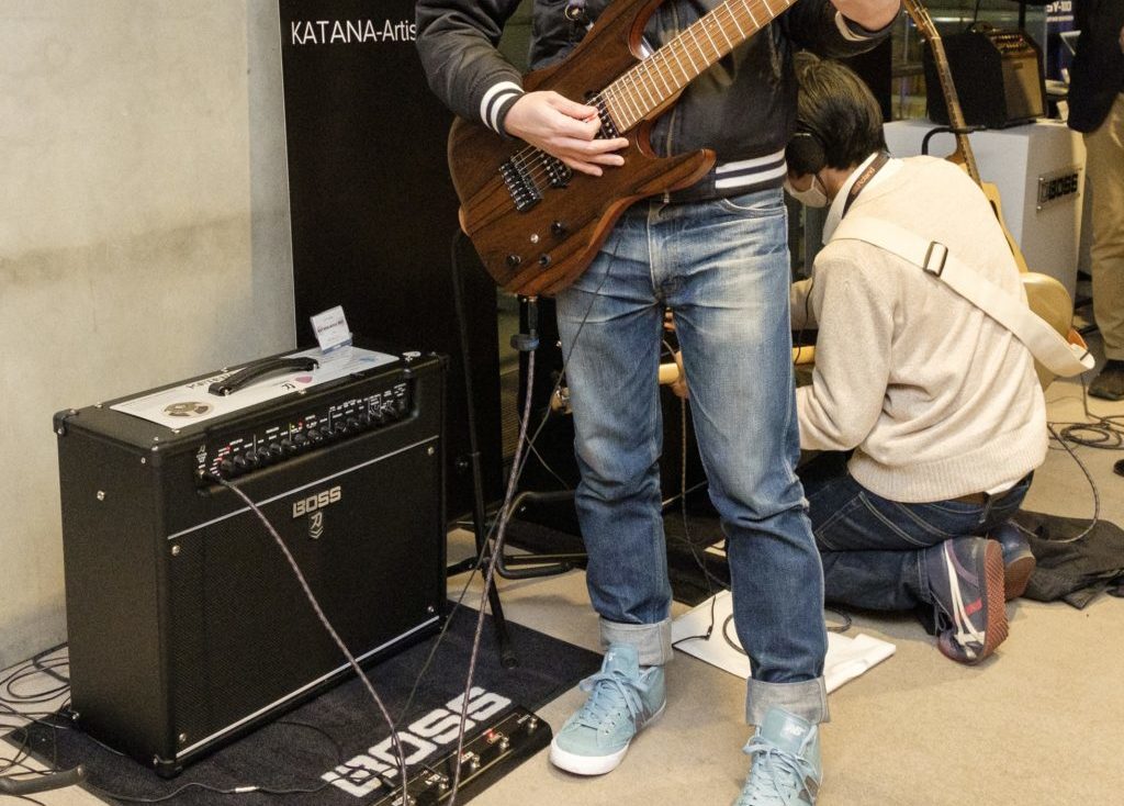 写真で試奏しているギターアンプは、「KATANA」ブランドの最新フラッグシップモデル「KATANA-Artist MkⅡ」。従来のアンプ・サウンドからさらにバリエーションの幅を広げ、合計10種類のサウンドを楽しめるように進化。まさにプロ仕様の一品となっています。