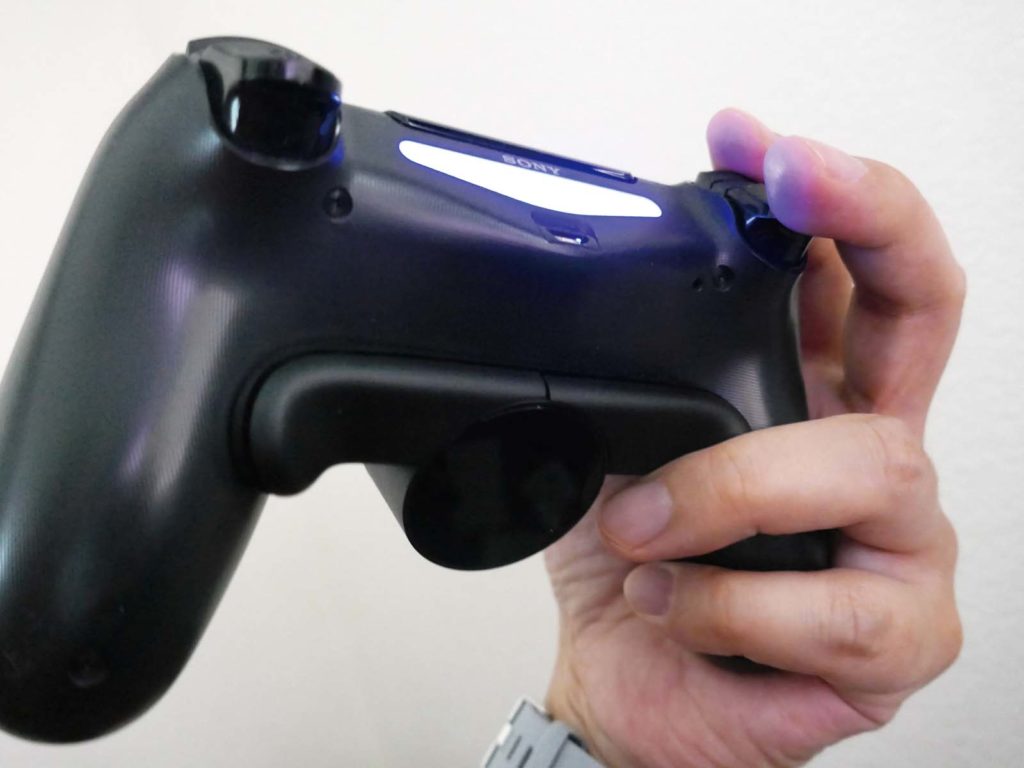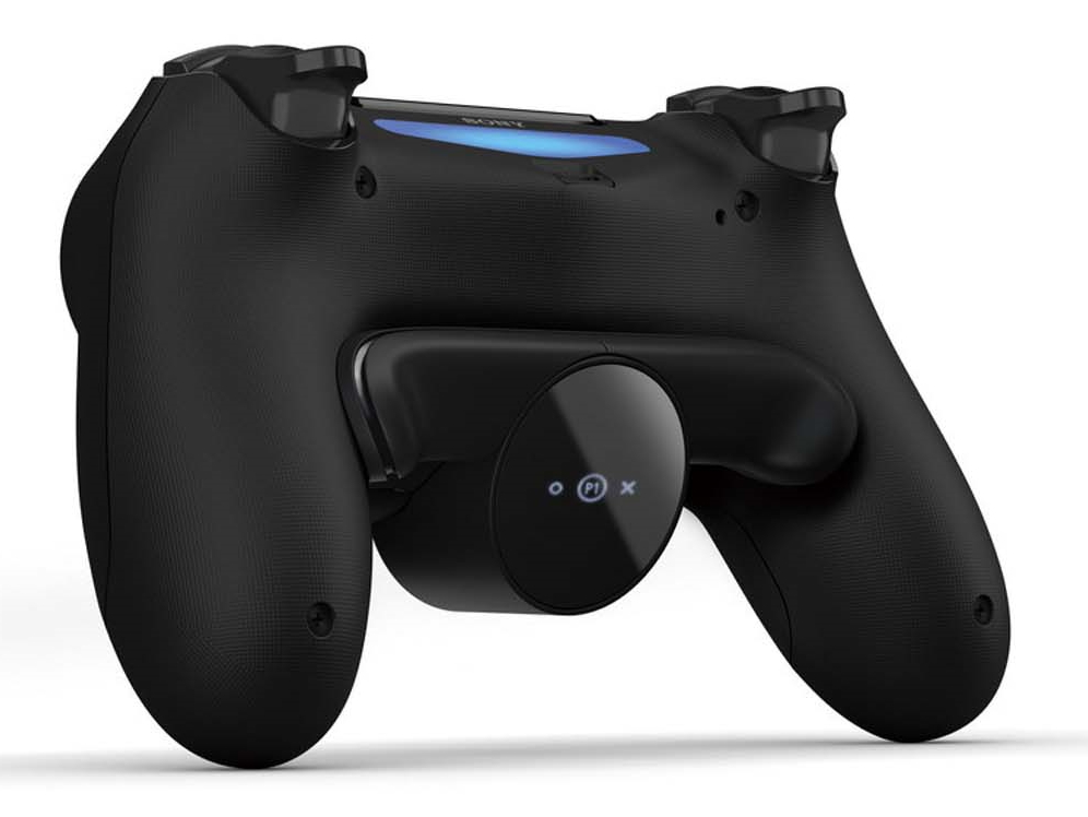 PS4用コントローラー・DUALSHOCK 4の背面にふたつのボタンを追加できる別売オプション。中央の有機EL部分を長押しするだけで、すぐに△○×□やLRボタン、十字キーの上下左右を割り当てられます。割り当てボタンを設定しておいたプロファイルは3つまで保存可能。ステレオヘッドホン/マイク端子を備えており、有線ヘッドセットを接続することもできます。