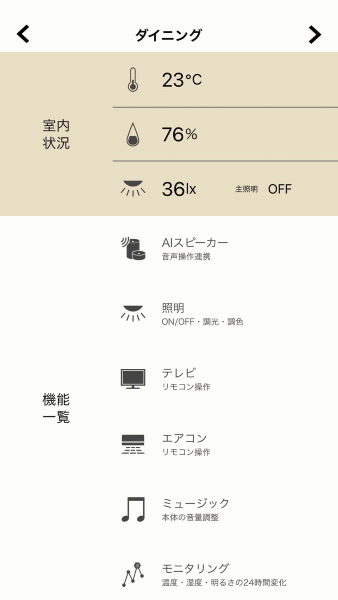 テレビやエアコンの赤外線リモコン操作が可能な専用アプリを用意。外出先から室内の温度・湿度・明るさをチェックすることも可能です。