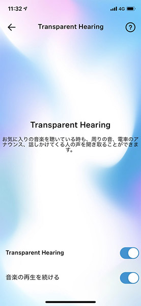 ゼンハイザーのMomentum True Wireless 2は外音取り込み機能をオンに切り替えた場合に音楽再生を継続するか、一旦ストップするか設定を選ぶことができるイヤホンです。アプリから「Transparent Hearing」を選んだ場合に、「音楽の再生を続ける」かどうかをトグルボタンのオン・オフによりスイッチします。
