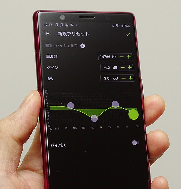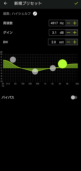 アプリの画面からはバッテリーの残量や接続コーデックが確認できます。TW1はフラットなままでとても自然で力強いサウンドを楽しませてくれますが、より低域やボーカルをブーストして聴きたい場合などにはアプリが搭載するパラメトリックEQ機能を使うとよいでしょう。ユーザーが好みのバランスをカスタマイズした値を保存して、繰り返し使うこともできます。
