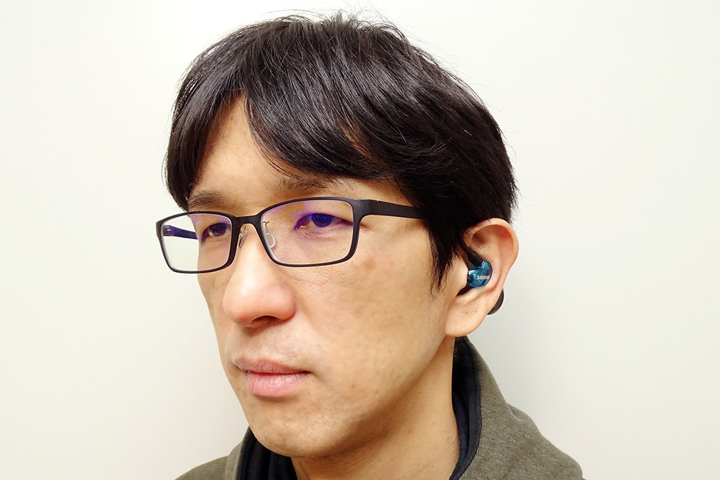 TW1はルックスが少し大柄に見えるかもしれませんが、SEシリーズと組み合わせた場合の装着感はとても心地よく、耳元での安定感も抜群でした。身に着けてしまえば意外に目立ちません。メガネの上からでも違和感なく装着できます。メガネのテンプルの形状にも依ると思いますが、筆者が普段使っているメガネはテンプルが薄肉形状だったので「TW1 on メガネ」も大丈夫でした。