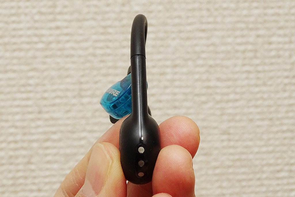 TW1を身に着けて体を激しく動かしても、特にSEシリーズとの組み合わせであればイヤホンが耳から落ちそうになることもありませんでした。1点気を付けるべきことは、AONIC 215として、またはTW1としても本体の防滴・防汗性能をうたっていないようなので、多めに汗をかくスポーツシーンや屋外で雨に打たれながら本機で音楽を聴くことは故障の原因にもなるので控えた方がよいでしょう。
