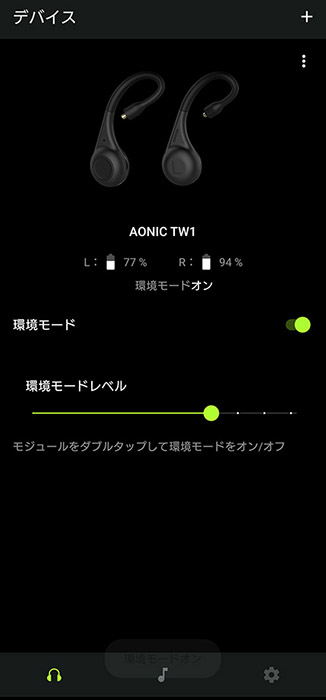外音取り込みのオン・オフはTW1本体のボタンリモコンをダブルクリックすると切り替わります。切り替わる際に短いブザー音が鳴って、オンになるとすぐに周りの音が聞こえてきます。音楽を再生しながら切り換えると、その差がややわかりづらい時があるので、ブザー音だけでなくボイスガイドも合わせて現在のオン・オフの状態を知らせてくれるとなおよいと思います。アプリのアップデートによる対応を期待したいところ。