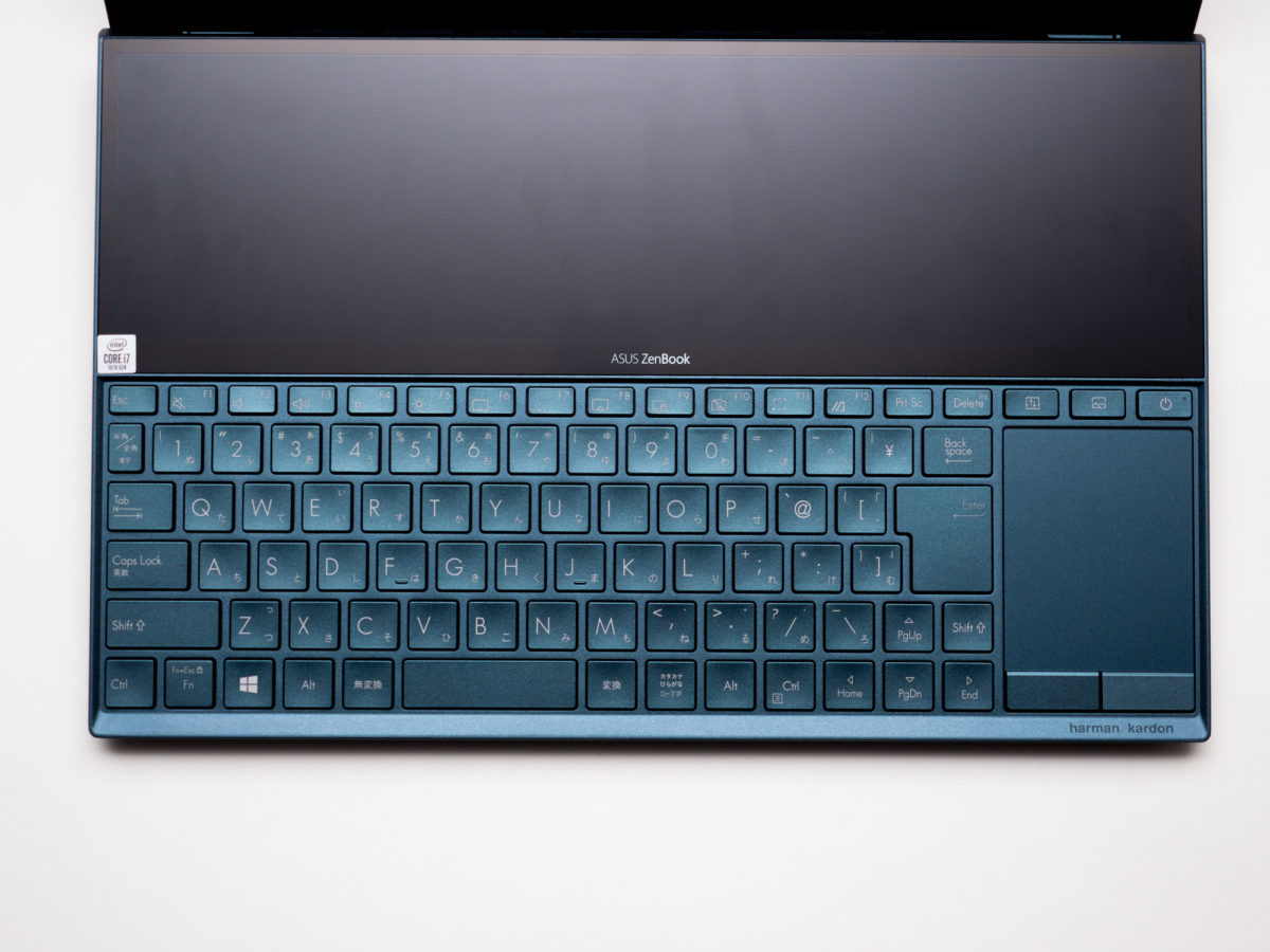 キーボードはScreenPad+によって下に追いやられており、本来そこにあったトラックパッドはキーボードの右側に収められています。結果、このクラスのノートPCとしてはキーボードサイズが一回り小さく、キーピッチは目測で約17.5mmに。これはおおよそ11.6型クラスのコンパクトノートと同程度のサイズ。タイピングの多いユーザーにはなかなか厳しい仕様と言えるでしょう。ホームポジションが大きく左に寄ってしまっているのも、かなり違和感があります。キー配列にはクセがなく、キーストロークも充分に確保されているので、慣れてしまえば問題ないとは思うのですが……。