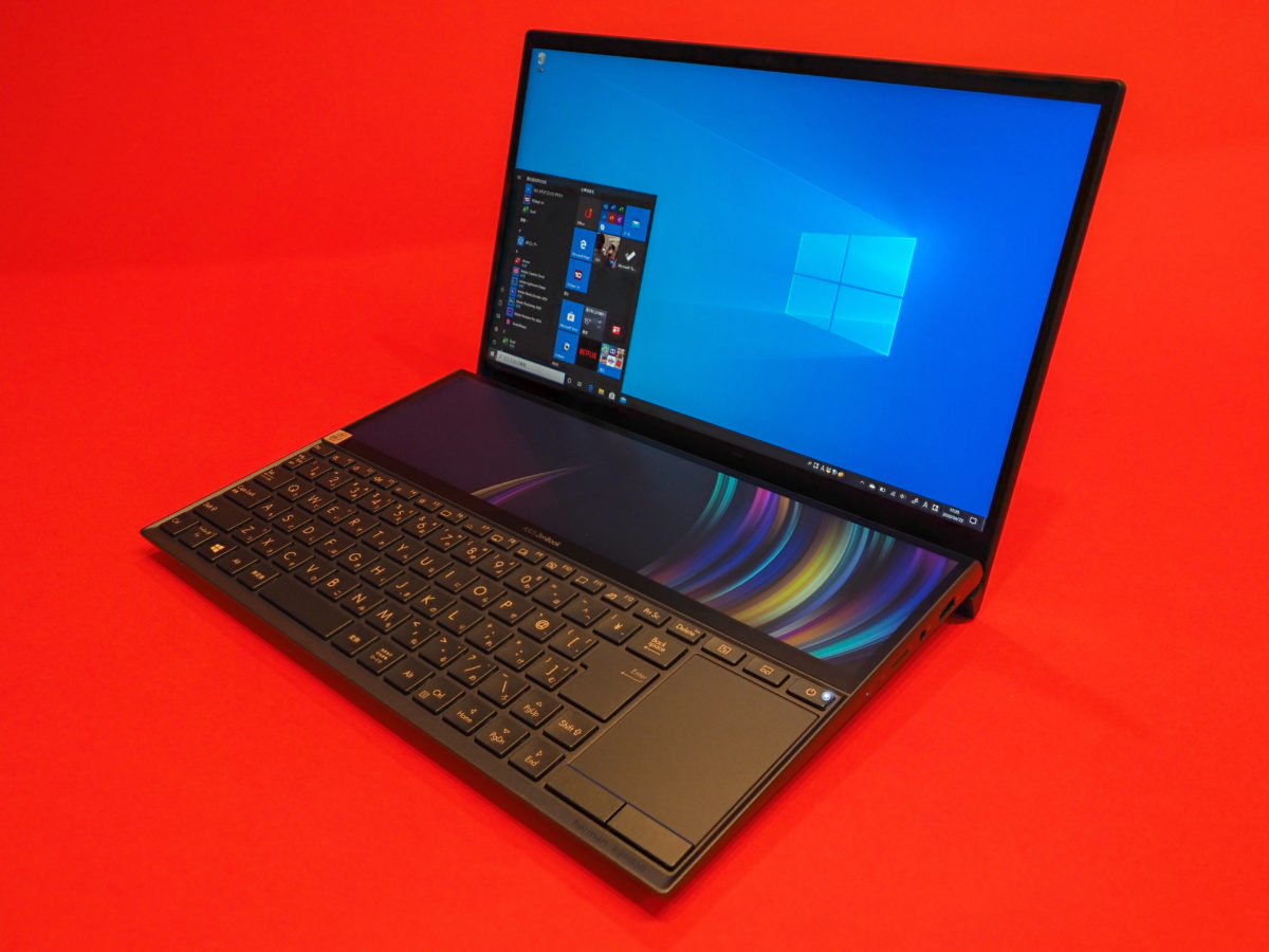 2020年5月7日に発表されたASUS「ZenBook Duo」は、昨年夏に発売され大きな話題となった2画面ノートPC「ZenBook Pro Duo」の小型モデル。メインディスプレイを15.6型の4K有機ELディスプレイから、14.0型フルHD液晶ディスプレイへの変更などで、モバイル可能なサイズ・重量と、18万2800円(Core i5モデル)/21万9800円(Core i7モデル)という現実的な価格設定を実現しています。ZenBook Pro DuoはASUS Store価格で46万6500円と超高額だったので、半額以下ということになりますね。