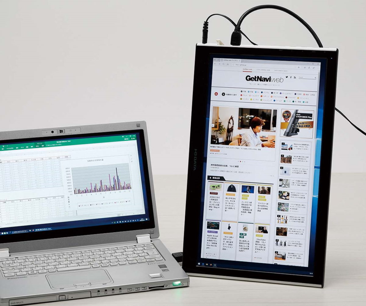 ノートPCにつなぐだけで簡単に2画面環境を構築可能。立てると、ウェブページや表データなどを快適に閲覧できます。