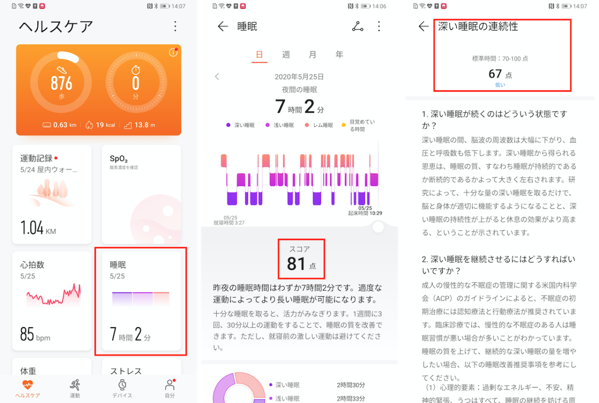 また、同じくメニューから「呼吸エクササイズ」を起動し、1分間から3分間の深呼吸を行えるようになっています。ストレスを感じたときには、こうした機能の併用もおすすめです。普段は目に見えないパラメーターの目安を知ることで、無理のない暮らしの行動を心がけられます。