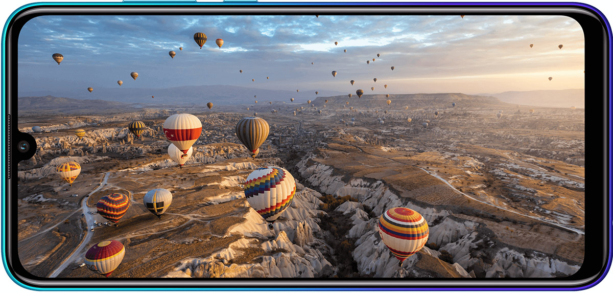 本体はセラミックのような上質な質感に、手になじむ3D湾曲デザインを採用。約6.21インチの大画面液晶ディスプレイ(2340×1080ピクセル)には、インカメラの面積などを最小限に抑えた「しずく型ノッチ」を採用。動画やゲームアプリも迫力のある映像で楽しめます。
