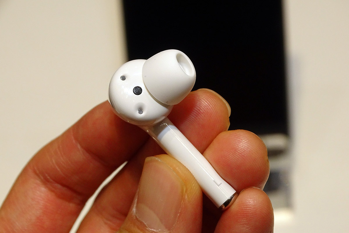 新製品体験会で試聴したイヤホンのサウンドは、特定の帯域をむやみに強調しないフラットなバランスが好印象でした。10mm口径の振動板から生まれるサウンドのいきいきとした力強さがストレートに伝わってきて、ボーカルの声、ピアノの音色も鮮度がとても高く、ベースやドラムスの低音はバネが効いています。中高域のディティールの再現力は開放型のFreeBuds 3の方が上手かもしれませんが、ふたつのイヤホンを使い分けて楽しむのもアリだと思います。