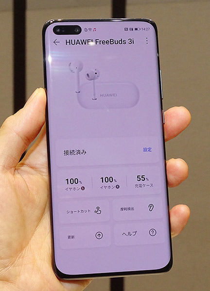 さらにファーウェイ独自のユーザーインターフェース「EMUI10」を搭載するファーウェイのスマホとの組み合わせではBluetooth設定のメニューを開かなくてもワンタッチで初期ペアリングができたり、音楽再生中にイヤホンを着脱すると自動的に再生のオン・オフがスイッチする便利な機能が使えます。