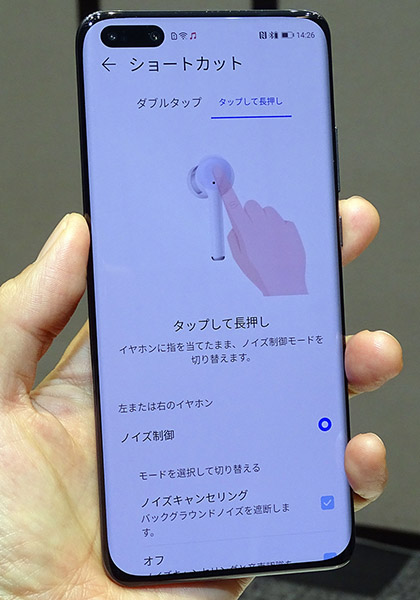 これほどまでに遮音効果が高いと、屋外で歩きながら使う場面でも安全に使えるのか、少し心配に思われるかもしれません。ファーウェイでは本機の発売後に予定するファームウェア更新により「外音取り込み」の機能を追加することを発表しています。使い勝手の点では安心できそうですね。