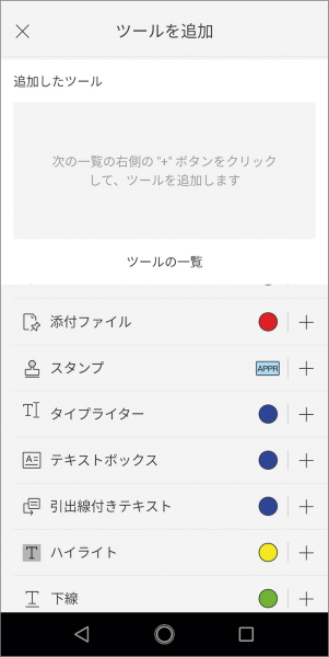 様々な機能やツールをワンタップで起動できるアイコンを集めた「ツールバー」を画面の下部に備えます。アイコンの配列は自分好みに変えられるので、よく使うものが手前に表示されるように整理しましょう。表示しきれない作業ツールは下部スワイプ操作で呼び出せます。