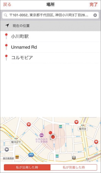 「ドラッグストアの近くを通ったら頭痛薬を買う」といったように、時間ではなく位置でリマインドしてもらうこともできます。通知タイミングを「出発時」か「到着時」か、指定することも可能。