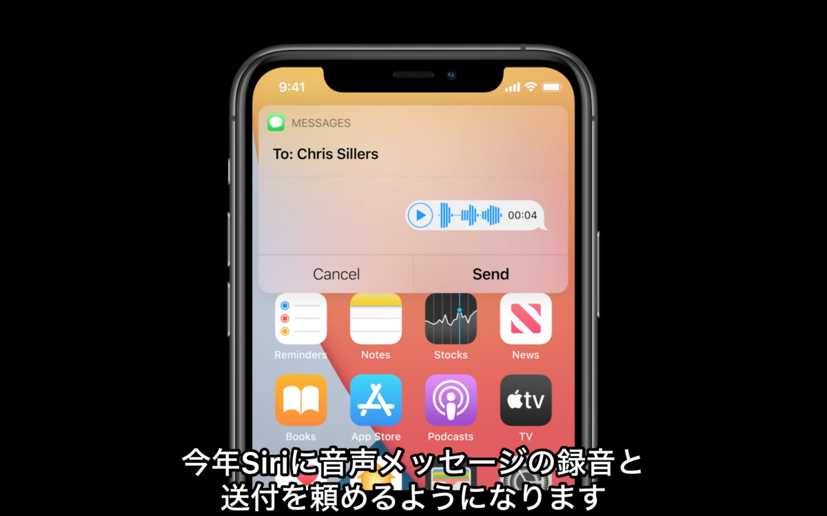 これまでは、Siriを起動すると、全画面がSiriの操作画面に切り替わっていましたが、iOS 14以後は、画面の一部でSiriが起動するようになります。また、音声メッセージの録音と送付ができるようになったほか、11言語に対応したリアルタイム翻訳など、機能面でも進化が発表されました。