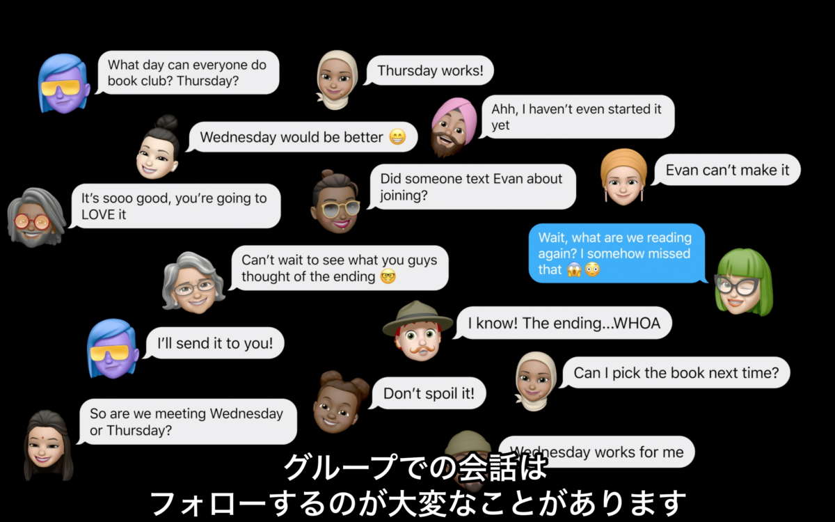 メッセージアプリでは、ミー文字のバリエーション数が増加。アクセサリーや表情の数が格段に増えています。また、スレッド表示に対応するなど、グループ会話時の視認性がアップする改善も加えられました。