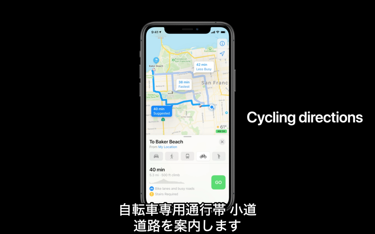 マップアプリには、自転車移動時の最適ルートを提案してくれる機能が登場。急坂や段差などを事前に教えてくれるため、自転車乗りにはかなりありがたい機能になりそうですが、これは米国、中国の一部のみでの対応になるとのことです。今後の対応拡大が待たれます。