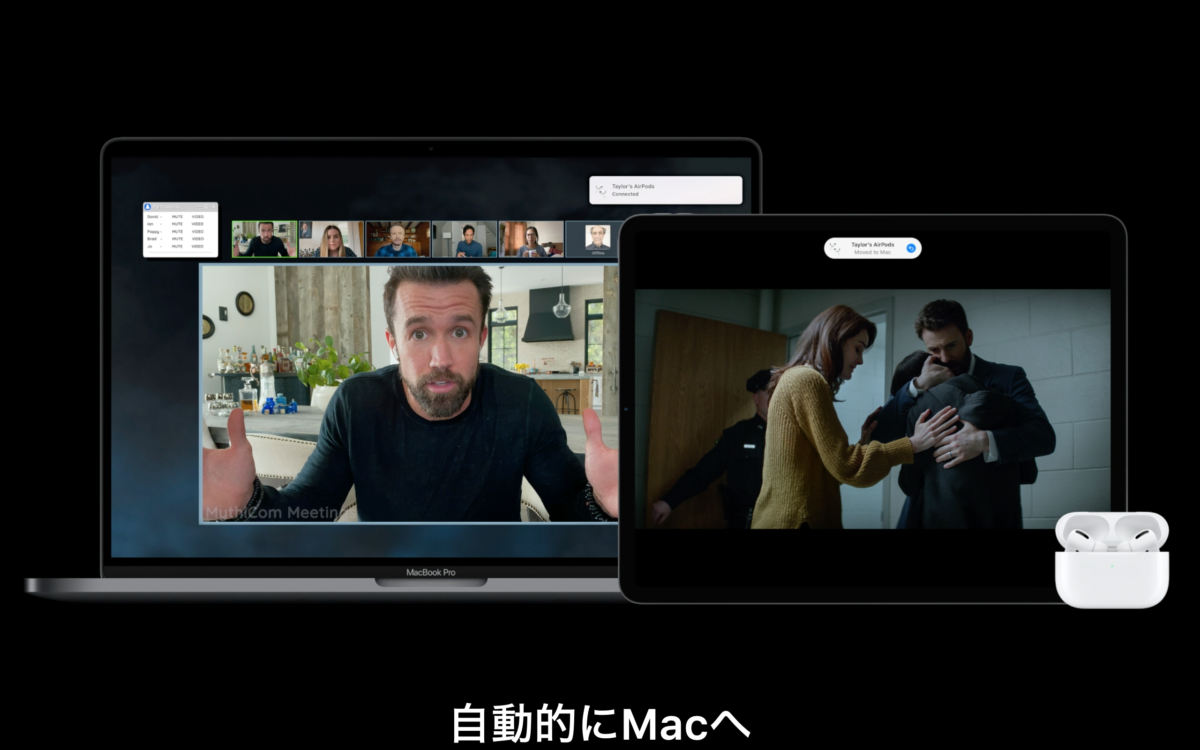 また、複数のデバイス間での接続切り替えがよりスムーズになります。MacBookで作業しながら音楽を再生している最中にiPhoneに電話がかかってくると、自動的に接続デバイスを変更し、こちらで操作をしなくても自動的にiPhoneでの通話に切り替わるといったことが可能となります。ビデオ会議などの需要が増えてきたので、複数のデバイス間でのスムーズな接続切り替えはうれしいですね。