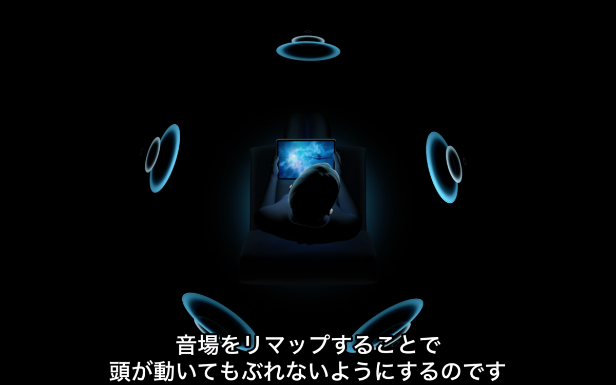 AirPods ProではSpatial Audioという立体音響に対応し、映画館のような臨場感のあるサウンドが楽しめるようになります。頭の動きなどをジャイロスコープやモーションセンサーで追従し、動きに合わせて音が追従するので、どんな状態でも最適なサウンドが楽しめるとのこと。最新の立体音響規格であるDolby Atomosにも対応する予定です。