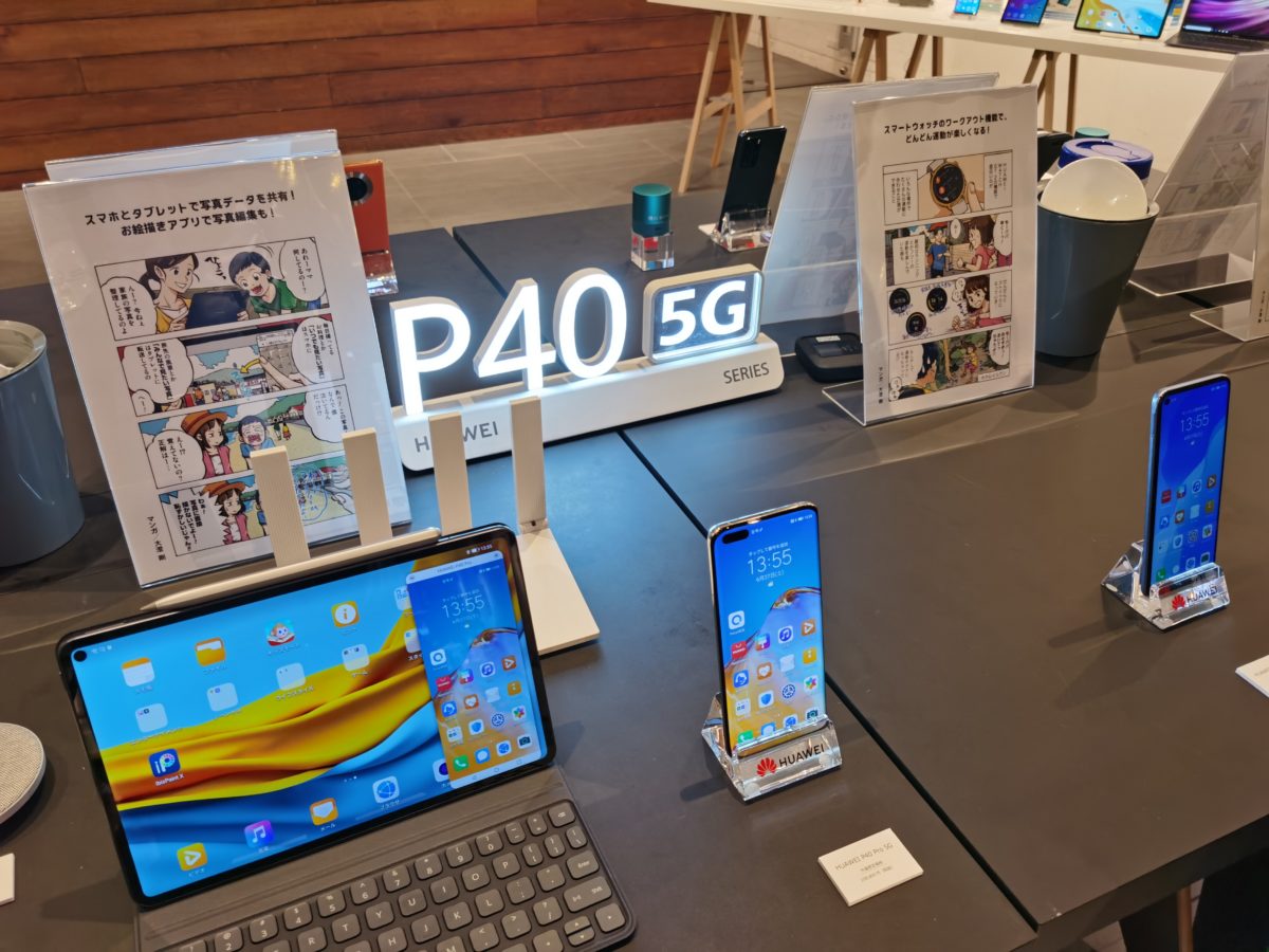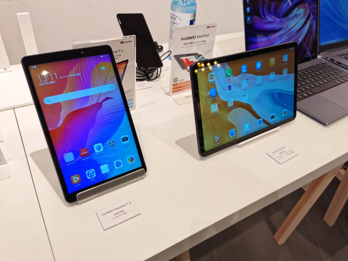 ファーウェイが6月2日にオンラインで開催した発表会では、スマホ3機種、タブレット3機種、パソコン1機種、ワイヤレスイヤホン1機種の計8モデルの日本発売が発表されました。イベント会場には、それら全モデルが展示されていました。